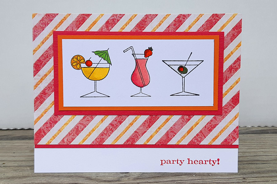 I pulled a complimentary sheet of patterned paper from the Pretty as a Peacock paper stack from Recollections, which really matched the fun bright colours of the drinks and the cardstock. Finally, I stamped a fun celebration sentiment in the bottom right corner.